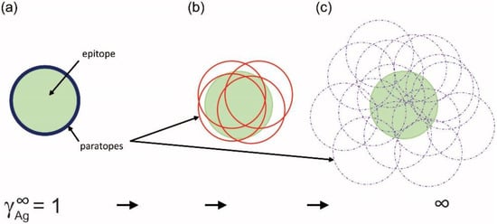 Interpretation of the limiting activity coefficient of antigen. The limiting thermodynamic activity coefficient reflects the contribution of epitope to binding by all antibody structures or the epitope-paratope fit in other words. Only the outlines of the paratope surfaces are shown (circles) to allow the visualization of overlaps. (a) A monoclonal antibody paratope-epitope fit is shown for comparison. Memory formation (b) reduces surviving clones to minimal optimal binders, while during an active immune response (c) several structurally distinct antibodies co-exist and compete for binding.