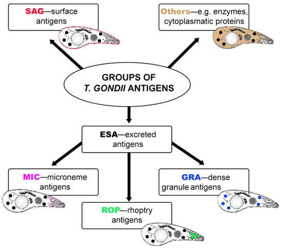 At present, most serological tests for detection of T. gondii infection require the preparation of native parasite antigens from tachyzoites harvested from mice or tissue culture. The methods of obtaining native antigens may vary significantly between laboratories. Furthermore, this antigenic preparation obtained from tachyzoites may contain various nonparasitic materials from eukaryotic host cells or culture media [47]. Serological assays based on whole-tachyzoite antigens can cause false-positive results and are difficult to standardize. For the past few decades, recombinant T. gondii antigens have been considered an alternative source of proteins preparation that are less expensive and easier to standardize in serological tests. Many different recombinant antigens have been obtained from bacterial and eukaryotic expression systems and evaluated for their usefulness in serodiagnosis of T. gondii infection in humans [47,48] or domestic and farm animals [49]. The sensitivity and specificity of assays for the detection of specific antibodies depend on the antigen used. Thus, the rational selection of recombinant protein is crucial for obtaining antigenic preparation with the best diagnostic utility. Very often, for the diagnosis of toxoplasmosis, surface proteins or antigens of secretory organelles of the parasite that are important in its life cycle and during host cell invasion are selected. T. gondii proteins are localized in outer membrane, cytosol, and secretory organelles (Figure 1): the micronemes, the rhoptries, and the dense granules from where they are released to the forming parasitophorous vacuole (PV) during host cell invasion or to the tissue cyst [50,51,52]. The micronemes and the rhoptries discharge their contents from the apical end of the parasite, and the dense granules discharge from the apical, lateral, and posterior surfaces. The contents of the three secretory organelles have been known to be released sequentially according to a cascade mode [51,53,54]. The microneme proteins (MIC) are released first, upon contact with the host cells. These proteins are involved in host cell recognition and attachment [48]. The rhoptry proteins (ROP) are released next, and they may facilitate formation of the PV and mediate its clustering with host cell organelles [55]. The dense granule proteins (GRA) are exocytosed both during and after invasion into the PV. Following secretion, most of the GRA antigens appear as both a soluble and a membrane-associated form in the vacuole and they are thought to modify the environment within the PV, thereby functioning for intracellular survival and replication [56,57]. Moreover, these proteins constitute an important fraction of antigens that circulate in the bloodstream during the first hours following infection [58]. The surface of T. gondii is covered with a family of lycosylphosphatidylinositol (GPI)-anchored antigens (SAGs) and SAG-related sequence (SRS) proteins, most of which are members of the SAG1 or SAG2 families [59]. These proteins appear to play a role in host cell invasion, immune modulation, and/or virulence attenuation, although they may also provide protection needed by the parasite to survive in the environment [59].