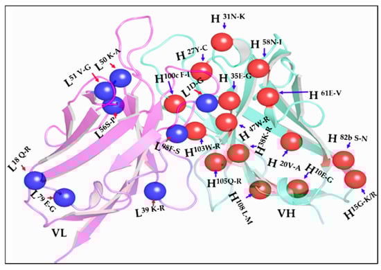 - Nakanishi, T.; Tsumoto, K.; Yokota, A.; Kondo, H.; Kumagai, I. Critical Contribution of VH-VL Interaction to Reshaping of an Antibody: The Case of Humanization of Anti-Lysozyme Antibody, HyHEL-10. Protein Sci. Publ. Protein Soc. 2008, 17, 261–270. [Google Scholar] [CrossRef] [PubMed]