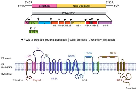 The genome of flaviviruses consists of a single open reading region flanked by 5′ and 3′ untranslated regions, both of which with secondary structures essential for the initiation of translation and replication []. The translation of the genome by the host cell machinery leads to a single polyprotein—this is a protein expression strategy that results in the generation of many proteins from a single polyprotein precursor through proteolytic cleavages [].