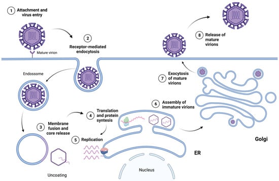 The nonstructural proteins assemble into the replication complex and drive the invagination of the ER membrane to produce replication organelles. The replication complexes replicate the viral RNA through a negative-strand RNA intermediate, resulting in a positive-strand RNA that is then packaged into new nucleocapsids and envelopes, creating immature virions []. Immature virions contain E and prM proteins, a lipid membrane, and the nucleocapsid. The protein prM makes the immature particles non-infectious by repressing the fusogenic activity of the E protein; therefore, immature virions are not able to induce host–cell fusion. These immature virions are secreted in vesicles and enter the trans-Golgi network (TGN), where they progress through chambers. The acidic pH in the TGN causes a rearrangement of the envelope proteins and the proteolytic cleavage of prM into pr and M by the cellular protease furin [], resulting in mature, infectious particles that then undergo exocytosis []. Figure 3 presents an overview of the flavivirus life cycle.