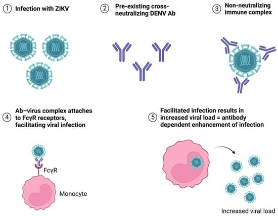 ZIKV- and DENV2-immune sera in mice enhanced disease severity after DENV2 infection, while inactivated-DENV vaccination enhanced infection and viremia after ZIKV infection []. Another study suggests that in individuals who were previously infected with DENV, a subsequent ZIKV infection would trigger the production of non-neutralizing antibodies or T cell responses specifically directed to DENV, resulting in inefficacy to control the ZIKV infection [].