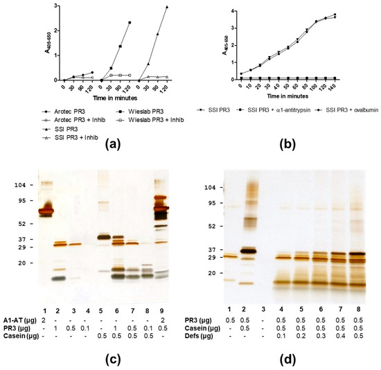 Proteolytic activity of PR3 preparations analysed by competitive inhibition assays and SDS-PAGE followed by silver staining. (a) Time-dependent hydrolysis of MeO-Suc-AAPV-PNA by Wieslab, SSI or Arotec PR3 with and without addition of inhibitor (MeO-Suc-AAPV-CMK). (b) Hydrolysis of MeO-Suc-AAPV-PNA by SSI PR3 with or without addition of α1-antitrypsin or ovalbumin (4 µg/mL). (c) Incubation of casein with varying SSI PR3 amounts pr lane. (d) Incubation of casein with SSI PR3 and varying α-defensin amounts pr lane.