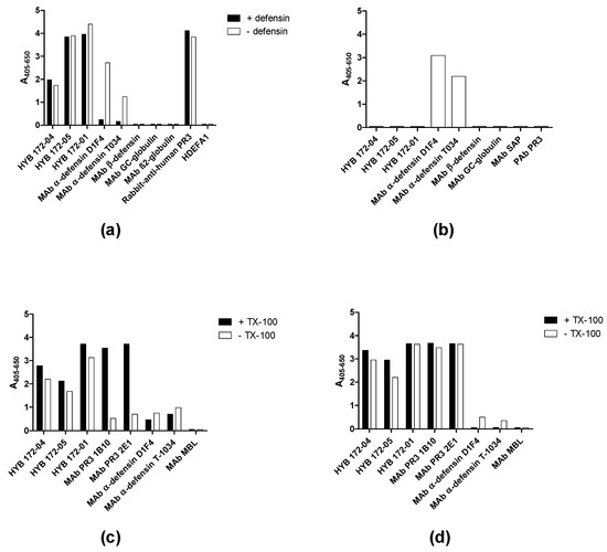 MAb binding to PR3 analysed by ELISA. (a) Binding of MAbs to SSI PR3 with or without addition of defensins. (b) MAb binding to coated defensins. (c) MAb binding to Wieslab PR3 coated with or without Triton X-100 (TX-100). (d) MAb binding to Arotec PR3 coated in the absence or presence of Triton X-100.