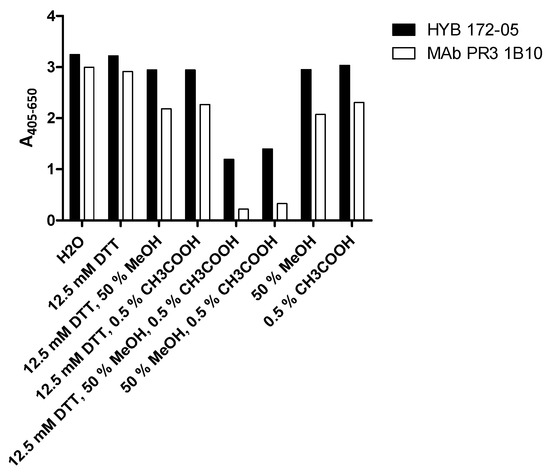 In the ELISA, it was observed that the three MAbs showed a slightly stronger reaction when SSI PR3 was coated in the presence of 0.01% Triton X-100, a tendency that was even more pronounced for two commercial PR3 MAbs (1B10, 2E1). However, this was less evident when coated with Arotec PR3 containing only a low amount of non-covalently associated defensins (Figure 3c,d), confirming that the MAbs reacted with PR3 itself (or the complex of PR3 and defensins) and not the associated defensins. The three MAbs showed identical titration curves in the ELISA, with 50% of maximal binding at 0.6 µg/mL (Table 2a). Elution assays with different buffers of different pH revealed that HYB 172-04 and 172-05 only dissociated from PR3 at pH = 2, whereas HYB 172-01 dissociated at pH = 4. All three MAbs dissociated at pH = 12, but not at pH = 11 (Table 2).