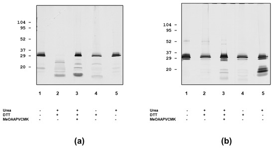 Composition and autoproteolytic activity of PR3 preparations and effect of pre-treatment with urea and DTT as analysed by SDS-PAGE followed by silver staining. (a) Wieslab PR3. (b) Arotec PR3.