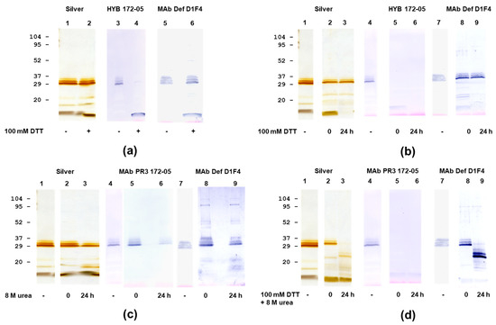 Immunoblotting analysis of PR3 (Wieslab). (a). Effect of DTT (100 mM) reduction during sample preparation. (b) Effect of long-term high concentration of DTT (100 mM) treatment. (c) Effect of long term 8 M urea treatment. (d) Effect of long term 8 M urea + 100 mM DTT treatment.