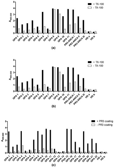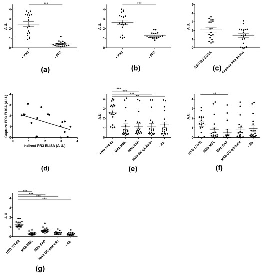 - Sun, J.; Fass, D.N.; Hudson, J.A.; Viss, M.A.; Wieslander, J.; Homburger, H.A.; Specks, U. Capture-ELISA based on recombinant PR3 is sensitive for PR3-ANCA testing and allows detection of PR3 and PR3-ANCA/PR3 immunecomplexes. J. Immunol. Methods 1998, 211, 111–123. [Google Scholar] [CrossRef] [PubMed]