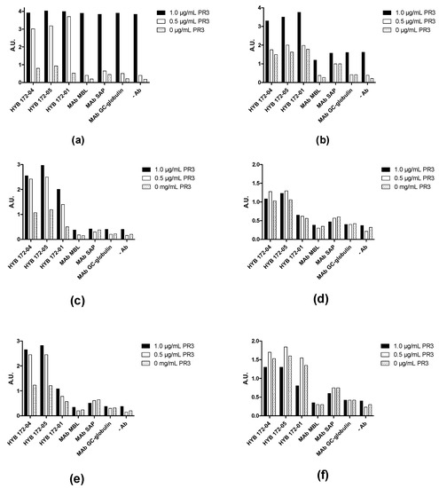 Screening of PR3 autoantibodies in GPA patient sera using PR3 (SSI) concentration-dependent capture ELISA. HYB 172-04, HYB 172-05, HYB 172-01 and irrelevant control MAbs were used as capture antibodies, in combination with PR3 concentrations ranging from 0–1 µg/mL. (a–f) illustrates the reactivity of 6 GPA PR3 AuAb-positive patients (2 strongly positive (a,b), 2 middle positive (c,d) and 2 weakly positive (e,f)).