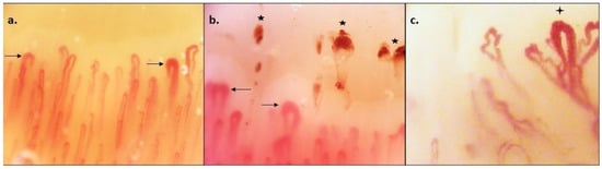 In eight reports, significant differences in NVC patterns were detected according to the autoantibody profile: the most explored autoantibodies were ACA and ATA. In an early report by Chandran et al., ATA+ patients showed more frequent capillary loss compared with ACA+ who displayed more frequent capillary dilations or giant capillaries []. Similar results were reported by Cutolo et al., in a cohort of 241 patients, concluding that ATA+ patients showed more frequent “Active” and “Late” NVC patterns than “Early”, suggesting a faster progression of the microangiopathy in this subgroup of patients []. Indeed, the authors concluded that the presence of ATA appeared to be related to an earlier expression of the “Active” and “Late” NVC patterns whereas the presence of ACA seems to be related to a delayed expression of the “Late” NVC pattern []. Analogue conclusions in terms of frequencies of “Early”, “Active” and “Late” patterns were reported by Sulli et al., and Pizzorni et al. [,]. These findings were later supported by a detailed analysis of 2754 SSc patients from the EULAR scleroderma trials (EUSTAR) database where Ingegnoli et al. reported that the “Late” pattern was present in 47% of ATA+ patients vs. 28% of ACA+ patients (p < 0.05) whereas the “Early” and “Active” patterns were more frequent in ACA+ than in ATA+ patients (44% vs. 28%, p < 0.05). Significant associations were found between ATA positivity and “late” SSc pattern, detected in 47% of patients, and between ACA positivity with higher prevalence in the “Early” and “Active” SSc pattern vs. the “Late” Pattern (45% vs. 43% vs. 27%, p = 0.03).