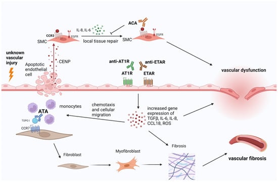 The molecular mechanisms, through which these antibodies act, involve intracellular signaling mediated by G-proteins which terminate in the increased transcription and synthesis of pro-inflammatory and pro-fibrotic mediators by endothelial cells and immune system cells (such as neutrophils and T cells) which impair the regulation of angiogenesis and enhance fibrosis from fibroblasts [].