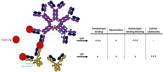 Third, IgM has been shown to recruit complement more efficiently compared to IgG [,]. Thus, complement-mediated tissue damage might be enhanced when IgM is the isotype of autoantibody present.