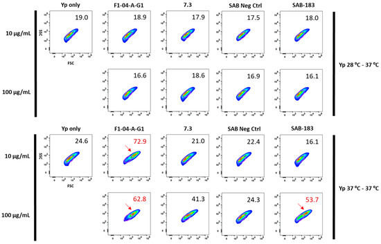 In order to evaluate if anti-F1, anti-LcrV, or polyclonal anti-rF1-V antibodies affected bacteria post-incubation we incubated Y. pestis grown at 28–37 °C or 37–37 °C with mouse monoclonal anti-F1 (F1-04-A-G1), anti-LcrV (7.3) mAbs, or with human polyclonal anti-rF1-V antibodies (SAB-183) derived from Tc bovines. Changes in the bacterial population, such as alterations in size or granularity, were assessed with flow cytometry. Incubation of Y. pestis grown at 28–37 °C with antibodies resulted in no overt change in bacteria relative to Y. pestis cells in the absence of antibodies (Yp only) or human polyclonal antibody from non-immunized Tc bovines (SAB Neg Ctrl) (Figure 2-Top). After incubation of Y. pestis grown at 37–37 °C with 10 µg/mL or 100 µg/mL of F1-04-A-G1 mAb, there was a noticeable change in size and granularity of the bacterial population. Further supporting the lack of availability of the LcrV protein to interact with antibodies (compared to the F1 protein), the bacteria grown at 37 °C −37 °C and incubated with 100 μg/mL of anti-LcrV antibody 7.3 exhibited an appreciable alteration as detected using flow cytometry, but the degree of aggregation was clearly less than that observed when the bacteria were incubated with the anti-F1 mAb, and this observation is not consistent between iterations. Although no change in bacteria was observed in the presence of 10 µg/mL of polyclonal SAB-183 antibodies, there was a marked shift in the bacterial population in the presence of 100 µg/mL of polyclonal SAB-183 material (Figure 2-Bottom).