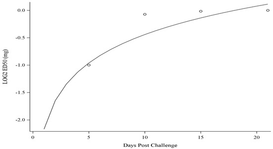 The ED50 is estimated from the mice (n = 30) treated with SAB-183 (0.5, 1, or 2 mg). The ED50 is estimated at selected time points using logistic regression (points in figure). In addition, a predicted value at each day postexposure is given using accelerated failure time model (solid line in figure).