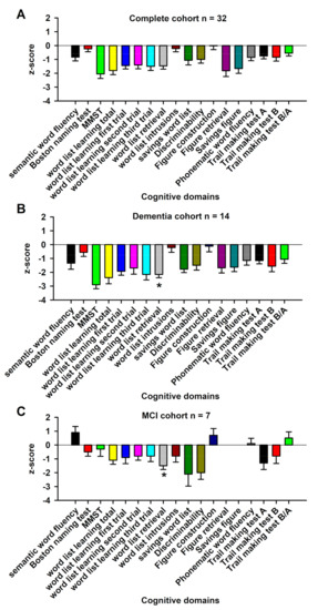 Cognitive profiles of the complete cohort, mild cognitive impairment patients, and dementia patients associated with neural autoantibodies. The cognitive profile, presented as z-scores of the CERAD test battery of the whole cohort, is shown in (A), dementia patients in (B), and mild cognitive impairment (MCI) patients in (C). Dementia patients with neuronal autoantibodies (B) were more impaired in verbal memory recall than mild cognitive impairment (MCI) patients with neuronal autoantibodies (C) * p < 0.005.
