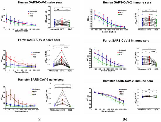 We used two SARS-CoV-2 recombinant proteins as antigens for in-house ELISA, namely N and RBD proteins. Untreated serum samples of humans, ferrets and hamsters who had no history of contact with SARS-CoV-2 infection did not bind with the N (Figure 1a) and RBD (Figure 2a) antigens. Interestingly, the heat inactivation of the sera at 56 °C significantly increased the levels of antigen-binding IgG antibodies in all cases, with the exception of RBD-binding human specimens (Figure 2a). This effect of non-specific IgG antibody binding was the most pronounced for animal sera, where much higher OD450 values were seen in the heat-inactivated groups compared to the untreated specimens, both for N and RBD antigens (Figure 1a and Figure 2a). These data indicate that the heat treatment of sera obtained from non-immune ferrets and hamsters can lead to false-positive IgG ELISA results. Strikingly, the treatment of the same serum specimens with RDE completely abolished the ability of the naïve sera to bind with SARS-CoV-2 antigens (Figure 1a and Figure 2a). When RDE-treated sera were compared to the untreated samples, there was no difference in the N-specific IgG antibody levels (Figure 1a). Although RDE treatment statistically significantly reduced non-specific binding to the RBD antigen for all species tested (Figure 2a), these differences cannot be considered clinically significant because of the very low antibody levels.