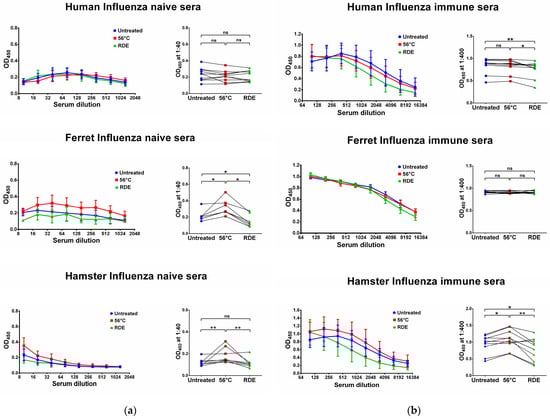 We further assessed whether the same effect of serum heat inactivation can be seen when analyzing influenza-specific antibody responses in naïve and immune sera of humans, ferrets and hamsters. We used archived human serum specimens from a study of immune responses to H5N1-inactivated influenza vaccine among individuals previously primed with H5N2 live attenuated influenza vaccine [44]. Since H5N1 avian influenza viruses have not circulated in the human population, serum specimens collected prior to the immunization with H5N2 LAIV were considered influenza-naïve in our study. Sera from subjects who responded to the H5N1 booster immunization were considered as influenza-immune specimens. Unlike SARS-CoV-2 antigens, the reactivity of influenza-naïve and -immune human sera with the whole influenza virus antigen was not affected by serum heating at 56 °C (Figure 3), although the RDE treatment of influenza-immune sera slightly reduced the levels of detectable virus-specific IgG antibodies (Figure 3b).