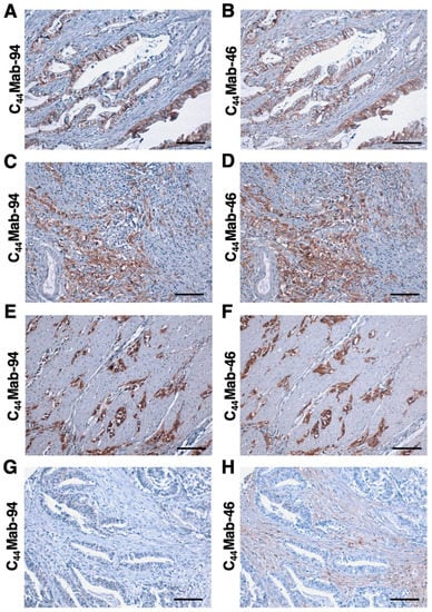 3.4. Immunohistochemical Analysis Using C44Mab-94 against Tumor Tissues
