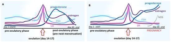 Comparison of the dynamics of hormonal changes during the menstrual cycle in women: (A) without conception and (B) with conception; FSH—follicle-stimulating hormone, LH—luteotropic hormone, hCG—human chorionic gonadotropin.