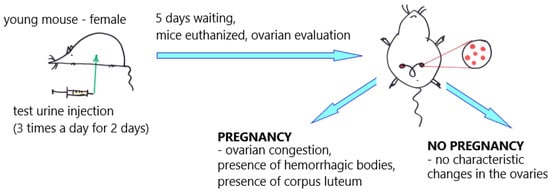 To test for pregnancy, the woman’s urine was injected into an immature male rat or female mouse. When the urine was from a pregnant woman, the injected rat exhibited an oestrous reaction despite its sexual immaturity. In the mouse version, sexually immature 3- to 4-week-old female mice weighing an average of 6–8 g were used for the A–Z tests. Five mice were used for each pregnancy test and injected subcutaneously with a total of 1.2–2.4 mL of urine in up to six doses over a period of forty-eight hours. The result was read, on average, after one hundred hours, and a positive result (pregnancy) was indicated by ovarian congestion, the presence of hemorrhagic bodies and numerous corpora lutea. Changes in the ovaries were assessed microscopically. Had the patient not been pregnant (negative), there would have been no such reaction in the mouse ovaries. The positive result A–Z test in the urine of pregnant patients was associated with the presence of gonadotropin in the urine, which is associated with pregnancy. It is also interesting that during the early A–Z test studies, scientists discovered that testicular tumors can also produce hCG [22,24,28]. Furthermore, hyperemia of the rat ovary has been reported to be present after the administration of luteinizing and luteotropic gonadotropins but not after the use of the follicle-stimulating hormone [29].