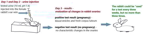 The rabbit could be reused for the test after about three weeks, but not more than three times. In practice, however, most rabbits that tested positive were killed after the test [30,31,32,33]. In the days when pregnancy tests were done on rabbits, the colloquial term “rabbit died” was synonymous with “you are pregnant”, which can be found in humorous phrases used to this day.