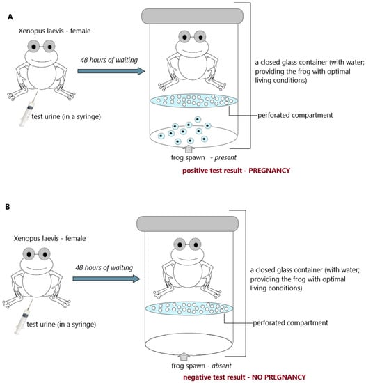 Mice, rats, and rabbits were replaced by frogs. The frog pregnancy test (“frog test”) was developed by the British zoologist Lancelot Hogben. Hogben’s test involved injecting a woman’s urine into an African clawed frog (Xenopus laevis). It is the only species of toad whose females are sensitive to gonadotropins present in the human urine of pregnant women. If the woman was pregnant, the frog ovulated within 2 to 8 h (Figure 4A). However, if the urine was from a non-pregnant woman, the frog did not spawn (Figure 4B) [26,39,40,41,42].