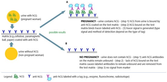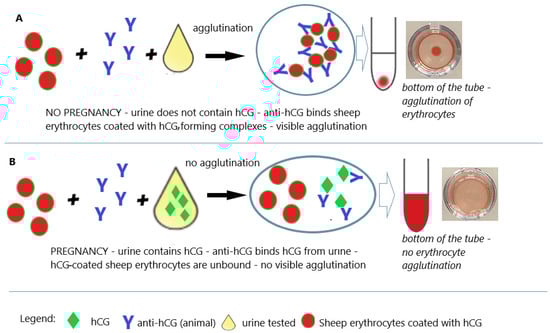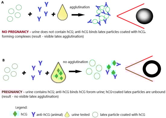 This test method detected hCG concentrations of 200 to 300 IU/L, and the analysis time was only 90 min. The test used a suspension of hCG-sensitized sheep erythrocytes preserved in formalin and rabbit anti-hCG antibodies. A suspension of sensitized sheep erythrocytes is combined with test urine and rabbit anti-hCG antibodies. If the test urine does not contain hCG (urine of a non-pregnant woman), anti-hCG causes agglutination of sensitized sheep erythrocytes (Figure 5A). If the test urine contains hCG (urine of a pregnant woman), anti-hCG antibodies bind to hCG from the urine and do not agglutinate sensitized sheep erythrocytes (Figure 5B) [50,51]. While this test was much faster and less expensive than conventional bioassays, it was relatively insensitive, especially for early pregnancy diagnosis, due to cross-reactivity with various drugs. Problems of this kind have been reported to require careful reading of results, as the presence of certain substances in the urine may result in false-negative or false-positive results. The predictive value (positive and negative) of hemagglutination pregnancy tests was estimated at an even 98%, although not all commercial blood cell tests available at that time were equally accurate [51,52]. Urine hemagglutination tests have also been an effective tool for detecting ectopic pregnancy [53].