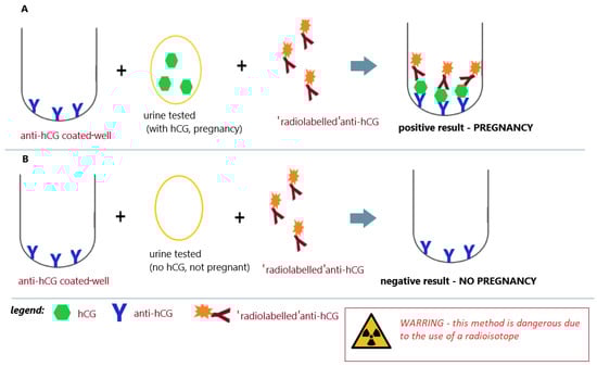 Radioimmunoassay for pregnancy; (A) positive result (pregnancy) and (B) negative result (no pregnancy); an illustrative scheme.