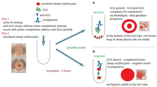 Complement fixation pregnancy tests used hCG-coated sheep cells on the surface, animal serum-containing anti-hCG antibodies, and rabbit serum as a source of complement proteins. In order to perform the test, the woman’s urine and the previously mentioned ingredients were added to the test tube. If the test urine did not contain hCG (no pregnancy), anti-hCG antibodies bound to hCG on the surface of the sheep erythrocytes, which activated the complement protein and led to lysis of the erythrocytes (Figure 9B). If the test urine contained hCG (pregnancy), the anti-hCG antibodies were bound by the hCG in the test urine and could not bind to the hCG on the surface of the sheep red blood cells. In this situation, complement was not activated on the erythrocyte membrane and did not cause their lysis (Figure 9A). Therefore, the lack of hemolysis indicated a positive test result and the presence of pregnancy in the examined woman. The ongoing process of hemolysis was, in turn, a confirmation that the tested hCG antigen was absent in the test sample, which proved the absence of pregnancy [26,80,83].