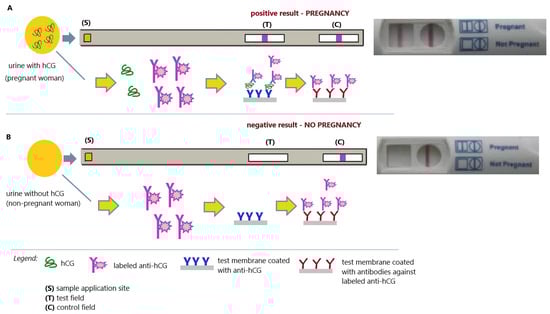 An immunochromatographic test (ICA), also called a lateral flow test, is a simple tool used to detect the presence or absence of a target analyte (usually an antigen or antibody). Immunochromatography is a laboratory technique that combines chromatography (separation of sample components based on changes in the way they pass through a specific sorbent) with immunochemical reactions (antigen–antibody reactions using a detection label). The most commonly used immunochromatographic system is a test strip (usually a cellulose membrane). Depending on the target analyte, antigens (for antibody detection) or antibodies (for antigen detection) are immobilized on a nitrocellulose membrane (test solid phase) in a defined area of this membrane (test result reading field—T). In the assay control area (control reading field—C), antibodies specific to the class and type of detection antibody (labeled with a chromogenic marker) are immobilized. In the space of the membrane between the sample application site and the T-field, free antibodies specific for the target analyte, labeled with a chromogen, are applied. The process begins when the test sample is added to the membrane (application site—S). The liquid matrix of the test sample (urine, serum, plasma, specific buffer) constitutes the liquid phase of the test. As the procedure progresses, the sample moves along the test membrane. In the area between the sample application area and the T-field, the analyte combines with specific chromogen-labeled antibodies (added in excess) to form immune complexes (analyte/antibody; the antibody can be specific for the analyte (when antigens are detected) or for solid fragments that determine the class of antibodies (when antibodies are detected)). Excess labeled antibodies remain unbound. In the course of the process, the resulting immune complexes (analyte/labeled antibody) are captured by specific antibodies (antigen determination) or antigens (antibody determination) immobilized in the T-field (giving a color line in this area). Excess unbound labeled antibodies are bound in region C (giving a control line). In the absence of the target analyte (antigen or antibody) in the test sample, immunological complexes are not formed in the initial area of the membrane, which means that the labeled antibody does not bind in the T-field, and no color line is formed. In this situation, only a control line is created where labeled antibodies are bound. The absence of a control line indicates incorrect performance of the test or some other (unspecified) reason for which the test is defective. In this situation, the test result is non-diagnostic, and the presence or absence of a colored line in the T-field is irrelevant [91]. The classic example of an immunochromatographic test is the home pregnancy test (Figure 10) [92].