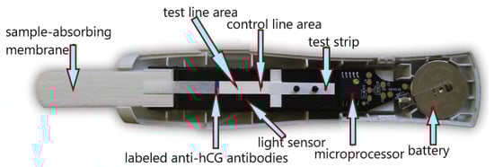 The digital (electronic) pregnancy test was introduced in 2003. The modified digital Clearblue Easy consists of a test chip in an absorbent tester and electronic and optical components in molded housings. The device comes in a ready-to-use format and no longer requires assembly before use. The test uses an immunochromatographic technique with biosensor reading. The digital test uses the same type of antibody as the original Clearblue test kit from which it was constructed (i.e., anti-beta hCG, goat anti-rabbit, anti-alpha hCG, and rabbit IgG). The Clearblue Easy Digital Pregnancy Test (SPD Swiss Precision Diagnostics GmbH) is a sandwich immunoassay that uses monoclonal antibodies specific for hCG and uses chromatography principles to separate bound and free markers. A reader is incorporated into the test stick that measures the reflectance of the light falling on the test and control lines to determine the test result or whether an error has occurred. The measurement result is converted into an electronic signal. The display shows whether you are pregnant (“pregnant”) or not (“not pregnant”) (Figure 12) [102].
