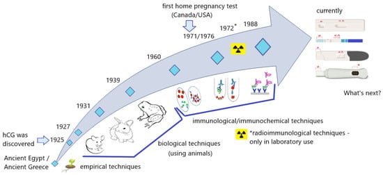 Until the 1960s, pregnancy tests were mainly biological methods involving laboratory animals, mainly mice, rabbits, and a specific species of toads [21,22,23,24,25,26,27,28,29,30,31,32,33,34,35,36,37,38,39,40,41,42,43,44,45,46].