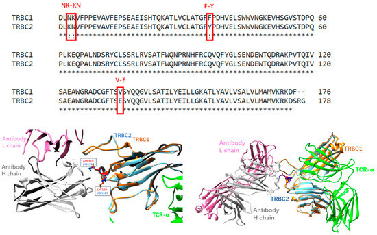TRBC1 and TRBC2 differ in four residues located in three different structural regions (Figure 1): NK or KN in positions 3-4; F or Y in position 35; and V or E in 134. Since F35 is buried and V134 is in the transmembrane domain, the only possible epitope to differentiate TCRαβ1 or TCRαβ2 is the N3K4/K3N4. The trivial change in epitope tests the sensitivity and specificity of antibodies to bind TCRαβ1 or TCRαβ2 selectively. Using a transgenic mouse line expressing a human V beta 3 C beta 1 TcR, monoclonal antibody JOVI-1 was obtained [2] and found to recognize only TRBC1-TCR (TCRαβ1) and not TRBC2-TCR (TCRαβ2) [2,3]. The JOVI-1 can be used as anti-TRBC1 antibody-based flow cytometric detection of T-Cell clonality [4,5,6] and, more importantly, to construct anti-TRBC1 CAR-T cells that kill TRBC1 expressing normal and malignant T cells while sparing TRBC2 restricted cells [3]. Other CAR-T targeting TRBC1 [7] or similar TRBV family members [8] expressed in malignant T cells were also reported. Interestingly, based on computational structure-guided specificity redirection of JOVI-1, three mutations of the JOVI-1 VH chain (T28K, Y32F, A96N) successfully switched JOVI-1 to bind the highly homologous target TRBC2-TCR (TCRαβ2) [9], opening another opportunity for the T-cell malignancy treatments.
