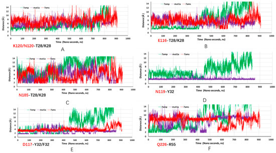 Trajectories of key hydrogen bonds from MD simulations of JOVI-1 TRBC1 (7amp, green line), JOVI-1/T28K TRBC1 (mut1a, purple line), and JOVI-1/KFN TRBC2 (7ams, red line). Residues in TRBC1 are in red font, and antibody residues are in black font. (A): distance trajectory between K120/N120 and T28/K28 residues. (B): distance trajectory between E116 and T28/K28 residues. (C): distance trajectory between N185 and T28/K28. (D): distance trajectory between N119 and Y32residues. (E): distance trajectory between D117 and Y32/F32 residues. (F): distance trajectory between Q226 and R55 residues.