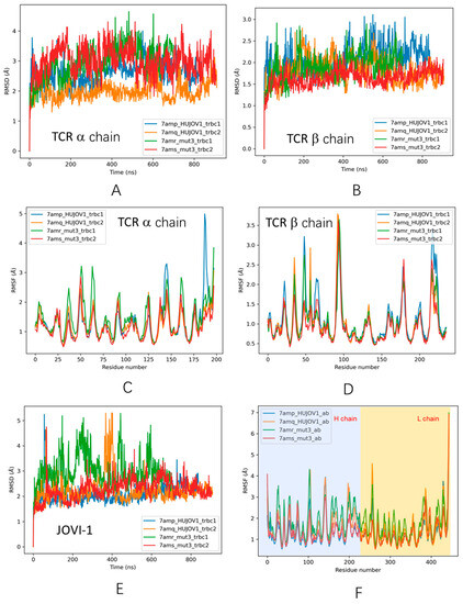 Trajectories of structural fluctuations during MD simulations. (A) RMSD of TCR a chain. (B) RMSD of TCR b chain. (C) RMSF of TCR a chain. (D) RMSF of TCR b chain; (E) RMSD of JOVI-1 antibodies. (F) RMSF of JOVI-1 antibodies.
