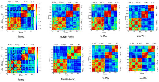 Our previous work [14] indicated that the communication between antibody and antigen could be reflected in the amino acid residue covariance matrix, which measures the motion correlations between any two residues in a protein complex. Figure 5 compares the covariance matrixes for the antibody–TRBC system with higher affinities (upper panel) and lower affinities (lower panel). While there are notable differences in correlations between antibodies and antigens, one can see that the correlations within antibodies have different features for the stronger binders and weaker ones: (1) the correlations between the constant domain and variable domain for both heavy and light chains (red squares corresponding to H-Ab/H-Ab and L-Ab/L-Ab) are more positive in the upper panel than in the lower panel; and (2) the correlations between heavy and light chain (blue and yellow squares corresponding to H-Ab/L-Ab and L-Ab/H-Ab) are more negative in the upper panel than in the lower panel.