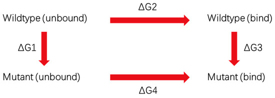 Free energy perturbation (FEP) calculations were performed starting from four different crystal binding poses (7amp, 7amq, 7amr, 7ams). In total, two kinds of systems were set up by using the CHARMM-GUI program. One was the antibody (light and heavy chain) in solvent (unbound state). The others were the TRBC and TCR-bound with antibody (bound state), both at 298 K and 1 atm. The system was solvated and ionized with the same condition described in the MD simulation section. The mutation of antibodies was conducted using the VMD program. NAMD all-atom molecular dynamics simulations [36] with CHARMM36 force field [33] were performed to equilibrate both kinds of systems using an NVT ensemble after a brief energy minimization. The dual-topology methodology and the soft-core potentials were applied to overcome endpoint singularities in the FEP simulation. The FEP method uses a thermodynamic coupling parameter λ, which is in the range of 0 to 1, to scale the potential energy change in mutating a residue on the antibody. In this study, one FEP calculation included 16 windows, ranging from λ values of zero to 1 (with a gap of 0.0625) for a total of 32 simulations per mutation since we ran both forward and backward simulations in each window to check the consistency of each simulation. The time step was 2.0 fs. During the FEP simulations, each window was equilibrated for 0.2 ns before collecting the FEP data based on the subsequent 0.8 ns simulations. After that, the change in free energy is calculated with Scheme 1 and Equation (1).
