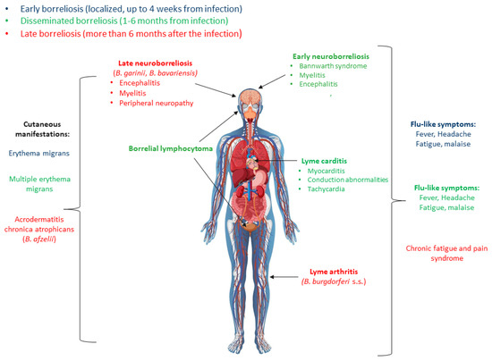 B. burgdorferi s.l. does not produce classic toxins or other recognizable virulence factors that directly cause damage to the host tissues. Therefore, it seems that multisystemic disorders are caused by too strong immune reactions to bacterial components [13]. In the course of Lyme disease, three stages are distinguished: early, early-disseminated and late (Figure 1) [1,14,15].
