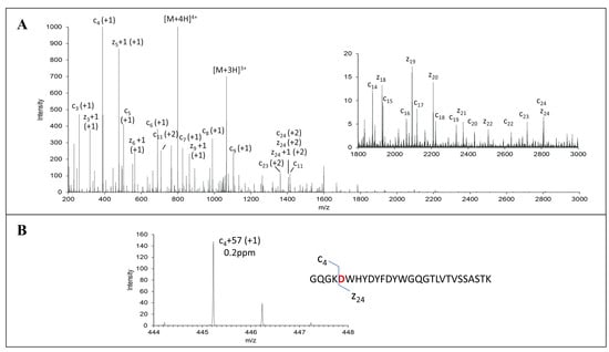 EAD MS2 spectra of deamidated peptide of MEDI7247 trypsin digestion sample. (A) EAD MS2 mass spectrum of 200–3000 m/z. Zoomed-in spectrum of 1800–3000 m/z is shown as an insert. (B) EAD MS2 spectrum of c4+57 signature ion of deamidation peptide. Sequence and cleavages are noted on the insets.