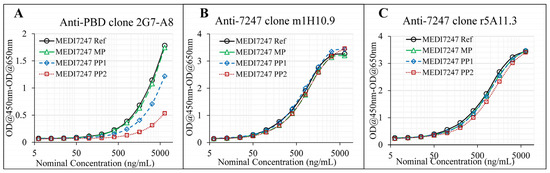 Three capture reagents, including two anti-IDs against the CDR region and one anti-PBD payload antibody, were examined for their capture ability for MEDI7247. The impact of deamidation on the binding of these three capture reagents was evaluated using MP, PP1, PP2 and Ref. Both anti-IDs’ ability to bind MEDI7247 (m1H10.9 and r5A11.3) was not impacted by N102 deamidation (Figure 4B,C). For anti-PBD 2G7A8, reduced binding to MEDI7247 was observed with PP1 and PP2 material (Figure 4A). Since the DARs of MP, PP1 and PP2 are comparable, the change in anti-PBD antibody binding characteristics suggests a potential tertiary structure change from the unique iso-aspartic acid deamidation. For the development of this method, anti-ID m1H10.9 was selected as the capture antibody.