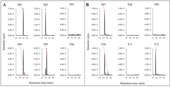 Representative chromatograms of the tryptic digestion peptides for (A) N320 and (B) N102. The top panel is nondeamidated peptides. The lower panel is the deamidated version of the corresponding top panel peptides.The red arrows point to the specific peak in the chromatograms corresponding with the label.