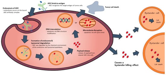 ADC possesses a tripartite structure, comprising an antibody designed for precise antigen binding, a potent and cytotoxic drug payload capable of triggering cell apoptosis, and a linker facilitating the connection between the antibody and payload (Figure 1). To transform ADC into a viable therapeutic option, three pivotal mechanisms of action come into play. Firstly, the antibody must exhibit a specific and selective affinity for an antigen or receptor present on the target cell’s surface. Secondly, the payload needs to successfully internalize within the target cell and subsequently engage with the designated target to initiate programmed cell death. Lastly, throughout the process of antibody and payload binding, as well as their internalization within the target cell, the linker must efficiently dissociate the payload at the appropriate moment to ensure a stable bond between the antibody and payload is maintained []. In the context of an ADC featuring all three essential components, a monoclonal antibody exhibits the capacity to selectively attach to and enter cancer cells characterized by an overexpression of antigens. Subsequently, it undergoes a series of intracellular processes, commencing with the formation of early endosomes, progressing to their maturation into late endosomes, and ultimately culminating in their association with lysosomes []. The ADC’s payload undergoes cleavage within lysosomes, either through chemical or enzymatic processes. Upon release, this payload exerts its cytotoxic effect by disrupting DNA or microtubules within the targeted cell, ultimately leading to cell death [] (Figure 2). Moreover, if the released payload possesses the capability to permeate cell membranes, it can trigger a bystander effect, causing neighboring target cells to undergo apoptosis without requiring ADC internalization []. Consequently, owing to the precise antibody binding and the pro-apoptotic nature of the payload, ADC offers several advantages, including a high therapeutic efficacy, cancer cell-specific targeting, relatively lower toxicity towards normal cells, and diminished side effects compared to conventional chemical cancer treatments [].