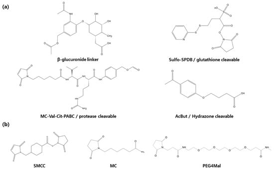 In the development of antibody-drug conjugates linkers play a crucial role. (a) Cleavable linkers include β-glucuronide linker, glutathione linkers, protease linkers, hydrazone linkers. (b) Non-cleavable linkers include SMCC, MC, PEG4Mal.