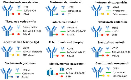 FDA-approved ADC. The majority of linkers utilized in ADCs are cleavable, although trastuzumab etansine used a noncleavable linker. The payloads used consisted of three types: a DNA-targeting agent (yellow), a tubulin-binding agent (red), and a topoisomerase 1 inhibitor (blue).