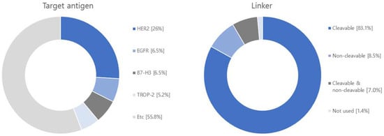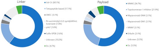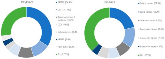 After analyzing 71 research papers published within the past five years on ADCS, we have identified a predominant focus on 36 different target antigens and 15 distinct payloads (Figure 6 and Table S1). The most extensively studied target antigen, appearing in 40% of the papers, is human epidermal growth factor receptor type 2 (HER2). HER2 is predominantly expressed in breast cancer and is also frequently found in other cancer types, including ovarian, uterine, gastric, and lung cancers [,]. A notable monoclonal antibody targeting HER2 is Trastuzumab, which is utilized in ADCs like Trastuzumab Deruxtecan and Trastuzumab Emtansine [,]. The next highly researched target antigen is the Epidermal Growth Factor Receptor (EGFR), which is primarily overexpressed in solid tumors such as lung, pancreatic, and colorectal cancers []. ADCs targeting EGFR include M1231 and Depatuxizumab mafodotin [,]. Another extensively studied target is the B7 homolog 3 protein (B7-H3) transmembrane protein, which exhibits rare expression in normal tissues but is frequently overexpressed in solid tumors. A representative ADCs associated with B7-H3 is Ifinatamab deruxtecan [,]. Tumor-associated calcium signal transducer 2 (TROP-2), a cell surface receptor involved in intracellular calcium signaling, is the fourth well-researched target. It is highly expressed in pancreatic, cervical, gastric, and cholangiocarcinoma. Representative ADCs for TROP-2 include Sacituzumab govitecan and Datopotamab deruxtecan [,]. Additionally, there is ongoing development of target antigens like c-Met (mesenchymal-epithelial transition factor), a hepatocyte growth factor receptor, human epidermal growth factor receptor type 3 (HER3), chondroitin sulfate proteoglycan 4 (CSPG4), which plays a role in stabilizing early melanoma cells, and CD30, a tumor necrosis factor receptor and tumor marker, for various ADCS applications [,,].