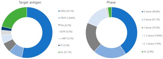 Diagram illustrating target antigens and clinical phases employed in clinical trials. Out of the 128 clinical investigations conducted, HER2 was the targeted antigen in 68 studies, while TROP-2 was the focus in 11 studies. Additionally, FRα was targeted in 8 studies, EGFR was targeted in 7 studies followed by c-MET in 4 studies. The remaining 30 studies targeted other antigens. In terms of clinical stages, 52 studies were categorized in phase 2, 25 in phase 1, 19 in both phases 1 and 2, 27 in phase 3, and 2 in the combined phases 2 and 3.