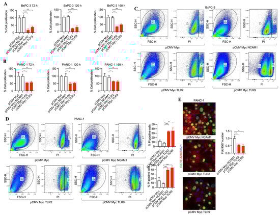 To investigate the potential of TLR2 and TLR9 inhibition in pancreatic cancer cells and its efficacy in tumor cell death, we developed pCMV Myc NCAM1, pCMV Myc TLR2, and pCMV Myc TLR9 plasmids expressing NCAM1 intrabodies (control intrabodies) and TLR2- and TLR9-specific intrabodies. First, we tested the transfection efficiencies of both BxPC-3 and PANC-1 tumor cells by transfecting them with pCDNA3 GFP plasmid. This demonstrated, for poorly differentiated PANC-1 cells, an increased transfection efficiency (60%) compared to moderately differentiated BxPC-3 cancer cells (35%) (Supplementary Figure S1A–C), suggesting a dependency on different growth characteristics and/or growth dynamics. We found that TLR2 and TLR9 intrabodies resulted in cell death as compared to the controls (pCMV Myc and pCMV Myc NCAM1) of BxPC-3 and PANC-1 cells (as shown by phase contrast imaging at 4× magnification, Supplementary Figure S2A,B) and 10× magnification (Supplementary Figure S2C,D). Next, we performed MTS assays to quantitate the cell proliferation in a time-dependent manner. Our results showed a significant decrease in cell proliferation by TLR2 and TLR9 intrabodies at 72, 120, and 168 h post-transfection as compared to the control plasmids (Figure 1A,B). Next, we performed propidium iodide (PI) staining for detecting dead cells using FACS analysis, and we found a significant increase in cell death in BxPC-3 (~30%) and PANC-1 (~30%) cells expressing TLR2 and TLR9 intrabodies as compared to the control cells (Figure 1C,D). Further, we investigated the proliferation marker Ki67, and consistent with our previous data, we found a significant decrease in Ki67-positive cells in TLR2 and TLR9 intrabody-expressing cells (Figure 1E). Thus, our results confirm that TLR2- and TLR9-specific intrabodies inhibit pancreatic tumor cell growth.