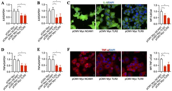 Downstream pathways that become upregulated by TLR2 and TLR9 result in increased inflammatory signaling [,], which was suggested to support cancer progression over time [,]. Thus, we asked whether TLR2 and TLR9 intrabodies reduce the inflammatory mediators IL-6 and TNF-α. Our results show a significant decrease in IL-6 mRNA in BxPC-3 (Figure 3A) and PANC-1 cells (Figure 3B). This was further confirmed by a decrease in IL-6 protein, as shown by immunostaining PANC-1 cells (Figure 3C). In addition to IL-6, our results also show a significant decrease in TNF-α mRNA in BxPC-3 (Figure 3D) and PANC-1 cells (Figure 3E), which was further confirmed by a decrease in TNF-α protein expression in PANC-1 cells (Figure 3F).