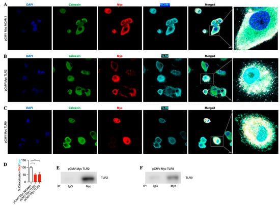 To evaluate the binding of TLR2 and TLR9 intrabodies to their respective target proteins and their ER retention, we performed immunostaining for the intrabodies, target protein, and Calnexin (ER marker). We found colocalization of these three proteins, indicating their binding (Figure 4A–C). Quantitation of the colocalization of Myc with their respective antigens (TLR2 and TLR9) showed at least 50% colocalization (Figure 4D) compared to NCAM1. Next, to confirm the binding of the TLR2 and TLR9 intrabodies to their target proteins, we employed an immunoprecipitation assay to pull down the bound complex using an the anti-Myc antibody, and our results showed a significant binding of TLR2 or TLR9 protein with intrabodies as compared to IgG (Figure 4E,F). Thus, these results show the binding of TLR2 and TLR9 intrabodies to their respective protein with a significantly inhibiting TLR function by their ER retention.