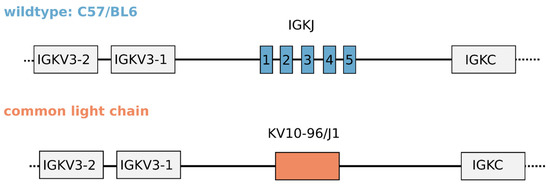 Previous germline rearrangement studies suggest that mouse models expressing a common light chain immune repertoire can be generated with minimal genetic engineering by following some guiding principles. First, complete replacement of the IGJK locus with the pre-arranged Vκ/Jκ segment ensures that no additional J-segments are available downstream of the inserted Vκ/Jκ segment for secondary rearrangement, which can lead to deletion of the pre-arranged segment at the kappa locus [36]. Furthermore, it would be beneficial to use a pre-arranged Vκ/Jκ segment that does not likely lead to the development of self-recognizing BCR, which would lead to receptor editing and potential replacement with a lambda light chain [35,45,46].